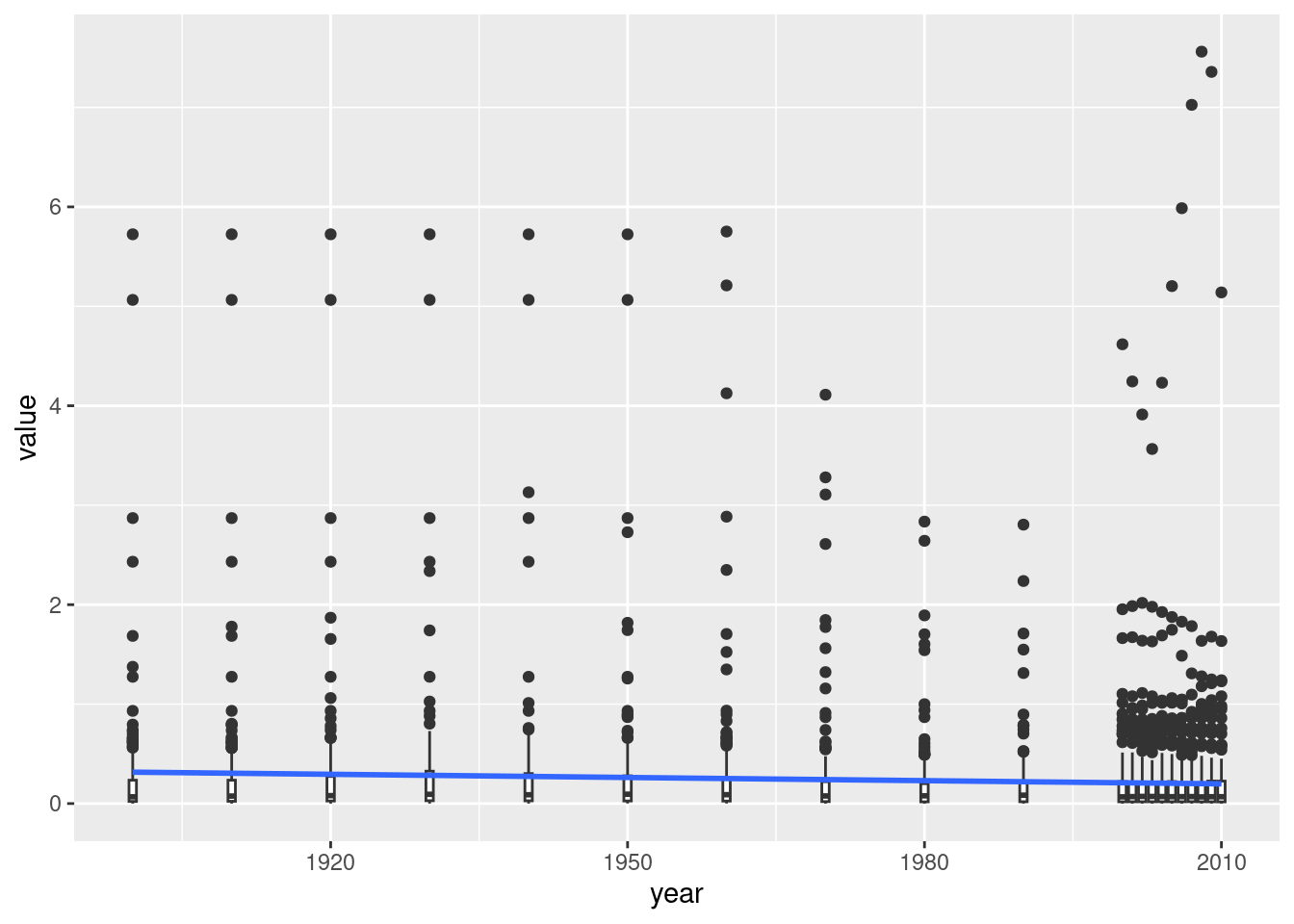 First of all, I would like to know what the global trend in goats/ capita has been since 1900. To do so we need to create annual averages and apply a simple linear model to them. We will also plot boxplots to give us an idea of the spread of goats/ capita over the world.